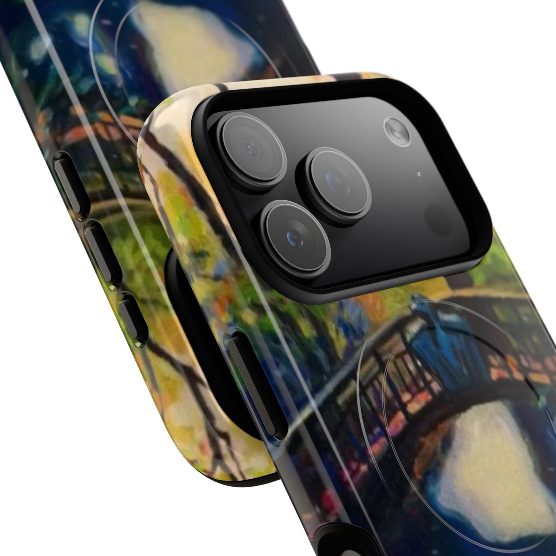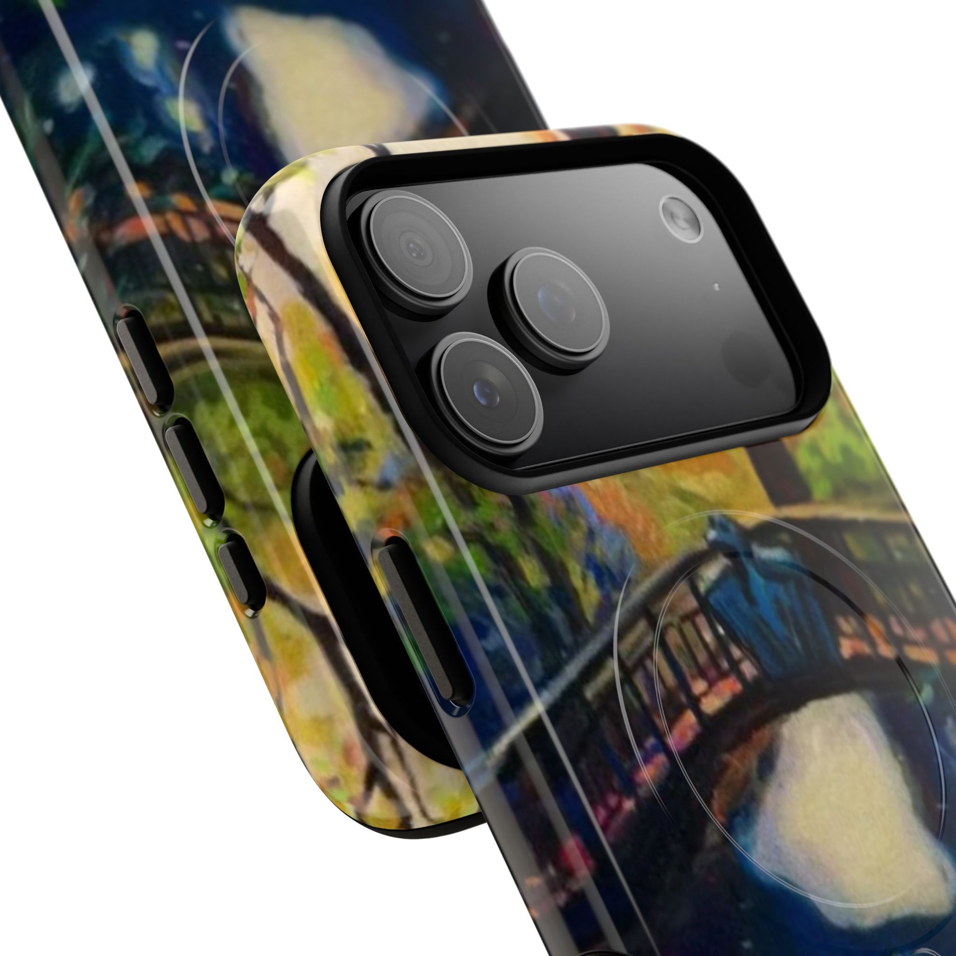 A slim, dual-layer phone case that brings a painterly bridge scene to your daily carry. The glossy or matte printed shell captures deep blues and warm sunset tones with full 3D wrap ink, while the soft TPU liner cushions bumps and drops. Built with a magnetic module compatible with MagSafe® accessories and precise cutouts for ports and speakers, this case balances artful style with protective performance. Lightweight yet impact-resistant, it fits new iPhone 17 series models and is crafted from durable polycarbonate and TPU sourced from South Korea.