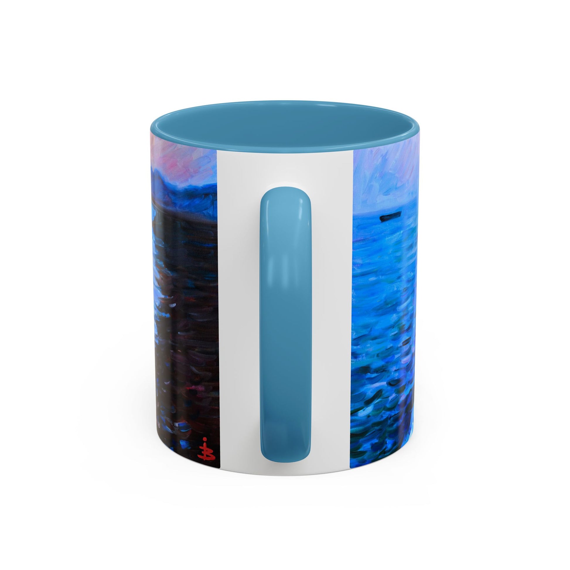 Dieser Keramikbecher bringt die Stille der Abenddämmerung am Meer in Ihr Morgenritual. Dicke Pinselstriche in Türkis und Kobaltblau kräuseln sich wie eine zurückkehrende Welle über die Oberfläche, während ein warmer Himmel in Korallen- und Lavendeltönen über einem fernen Pier leuchtet. Die farbige Innenseite und der Henkel verstärken diesen Kontrast – trinken Sie Ihren Kaffee aus diesem glänzend schwarzen Becher und fühlen Sie sich augenblicklich ans Meer versetzt. Er ist wie geschaffen für ruhige Momente: einen langsamen ersten Schluck, ein Skizzenbuch neben sich oder ein spätabendliches Gespräch im Schein einer Lampe. Das Motiv erstreckt sich um den Becher herum, sodass es sowohl für Links- als auch für Rechtshänder gut erkennbar ist, und der robuste C-Henkel liegt vertraut und sicher in der Hand.