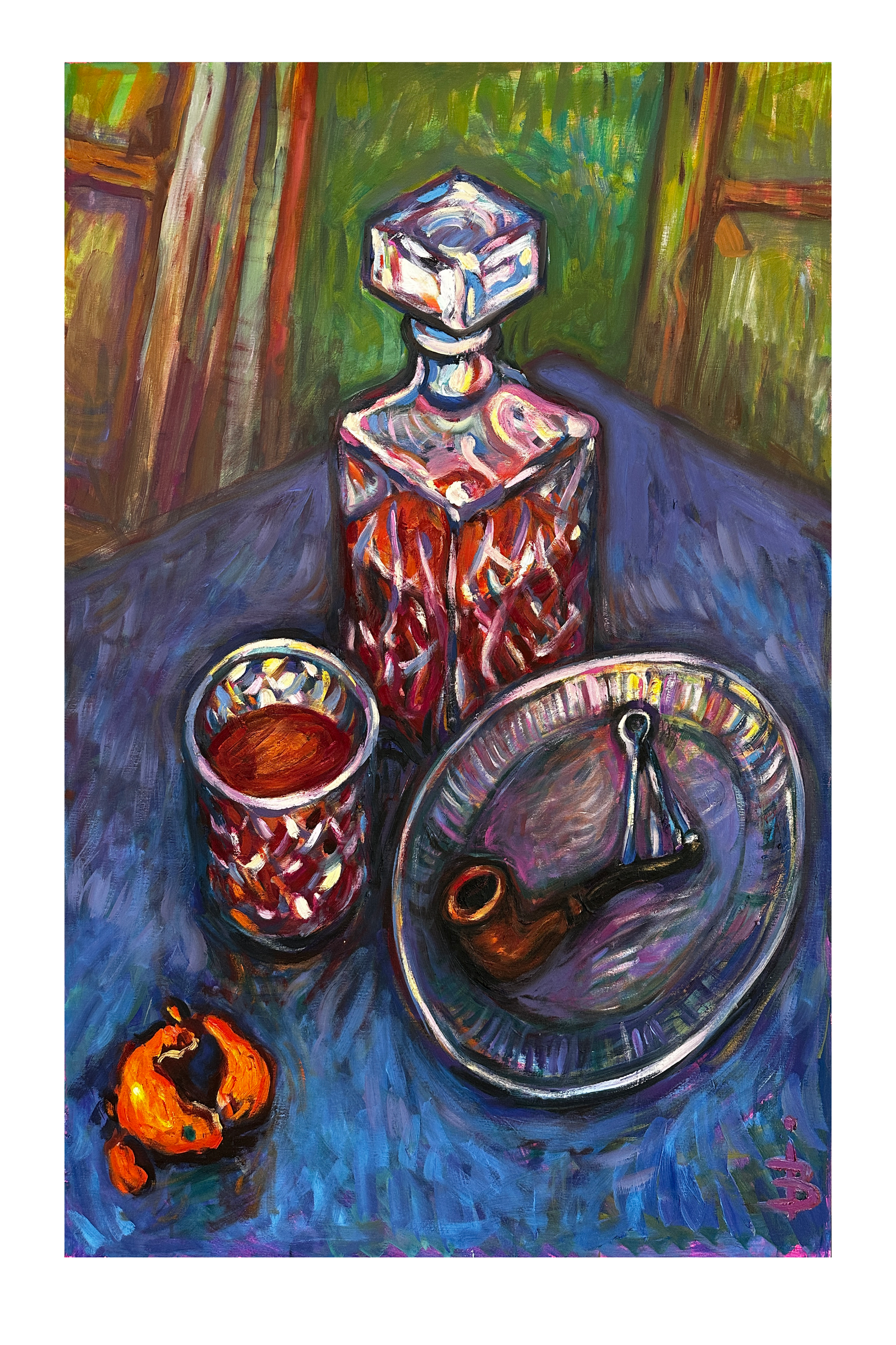 Feiern Sie Tradition und Eleganz mit diesem Stillleben-Wandbild. Eine facettierte Whiskykaraffe und ein passendes Glas fangen warme Bernsteintöne ein, die durch die Zartheit eines Pfirsichs und die Präsenz einer Tabakpfeife ergänzt werden. Diese stimmungsvolle Komposition vereint Gemütlichkeit, Raffinesse und Kunstfertigkeit – perfekt, um Ihr Zuhause zu bereichern.
