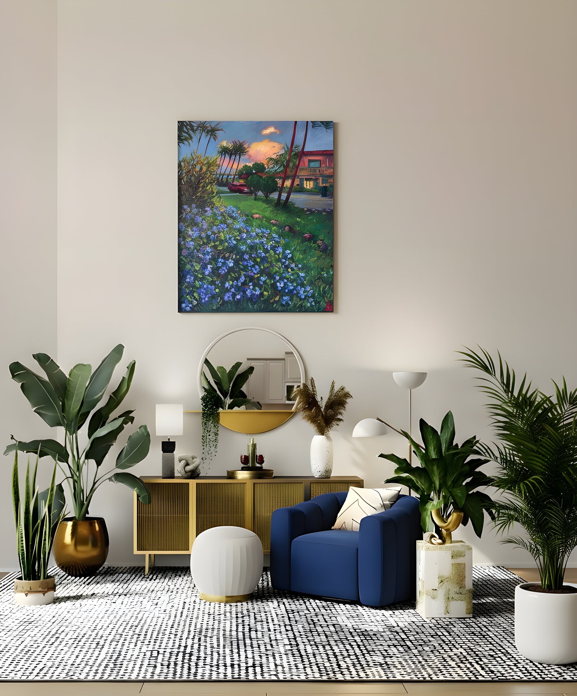 “South Florida” captures an evening landscape where water is almost absent — yet its presence is unmistakable. The sense of place is built not through literal depiction, but through air, color saturation, and light. Warm evening illumination fills the scene, creating an atmosphere that immediately feels Floridian.