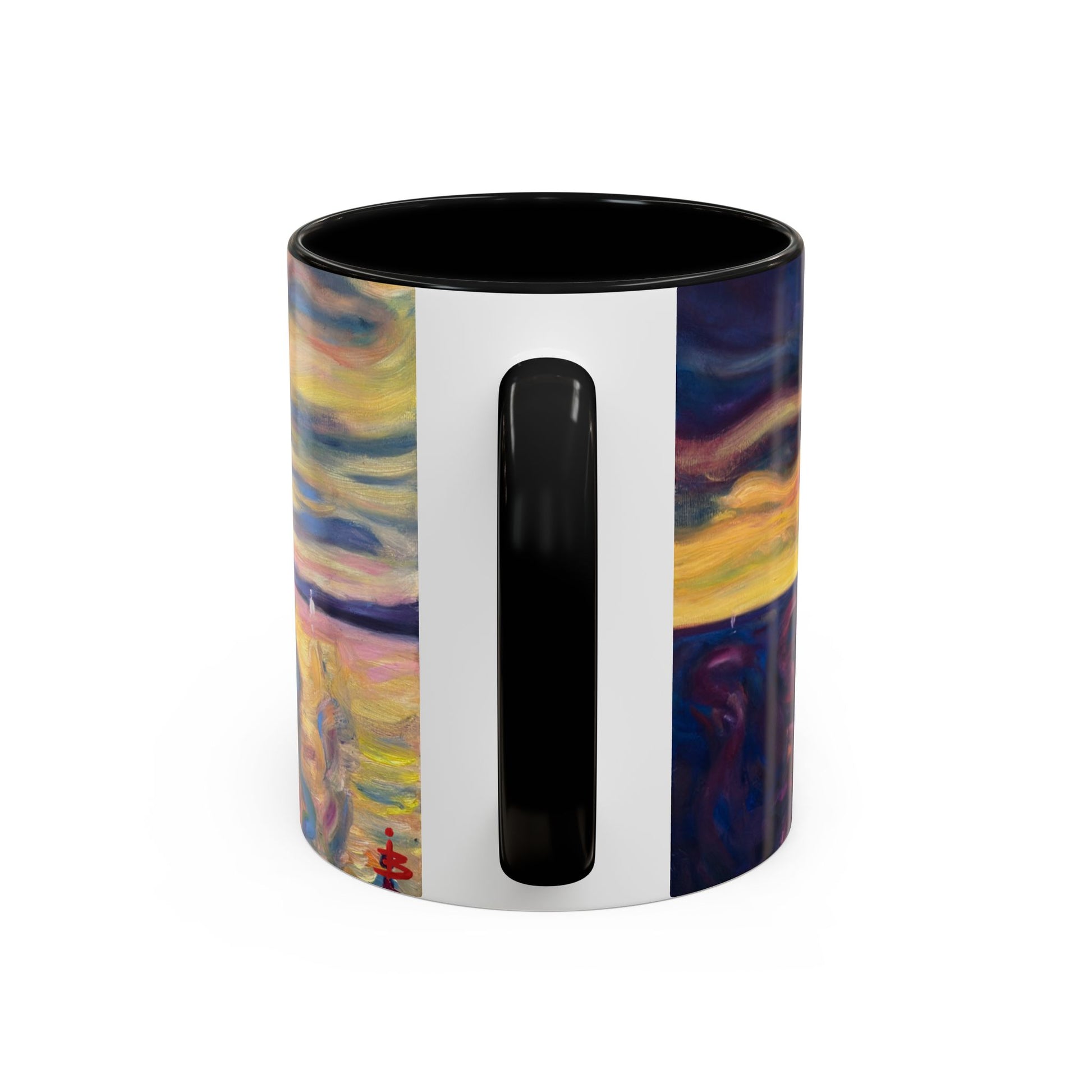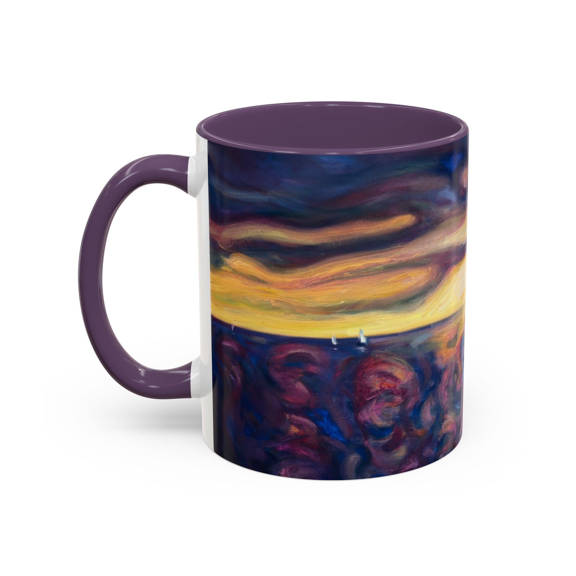 Ein handgemalter Sonnenaufgang auf glänzender Keramik – diese Tasse verleiht Ihrem Morgenritual eine sanfte, malerische Ruhe. Zarte Farbwirbel der Morgendämmerung umhüllen die Tasse und vereinen Lavendel, Pfirsich und Ozeanblau zu einem impressionistischen Horizont. Die farbige Innenseite und der Henkel setzen einen Akzent, der das Kunstwerk widerspiegelt und jeden Schluck zu einem stillen Moment von galerieartiger Schönheit macht. Sie passt sowohl in den Alltag als auch in entspannte Wochenendmorgen; sie bietet Platz für Gespräche, Kaffee, Tee oder einfach eine ruhige Pause.