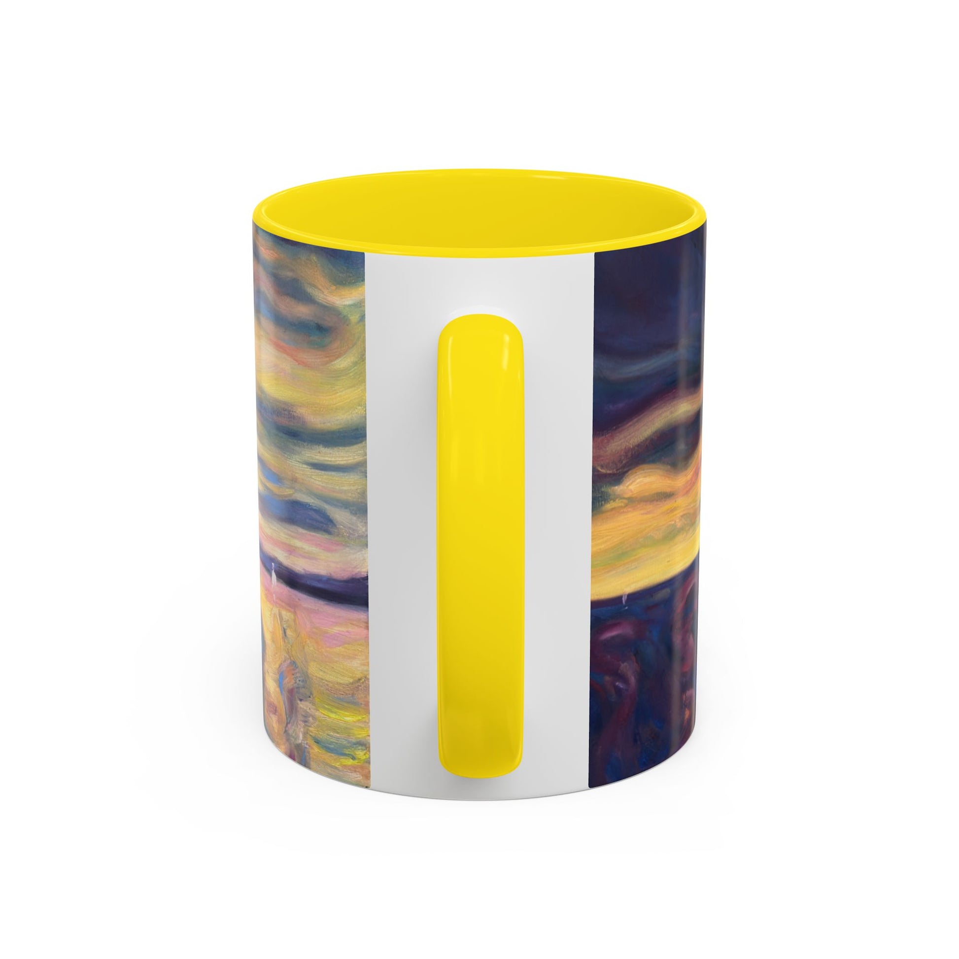 A hand-painted sunrise captured on glossy ceramic — this mug brings a gentle, painterly calm to your morning ritual. Soft swirls of dawn colors wrap the cup, blending lavender, peach, and ocean blues into an impressionistic horizon. The colored interior and handle add a pop that mirrors the artwork, making every sip feel like a quiet moment of gallery-worthy beauty. Fits into weekday routines and slow weekend mornings alike; it holds conversation, coffee, tea, or a quiet pause.