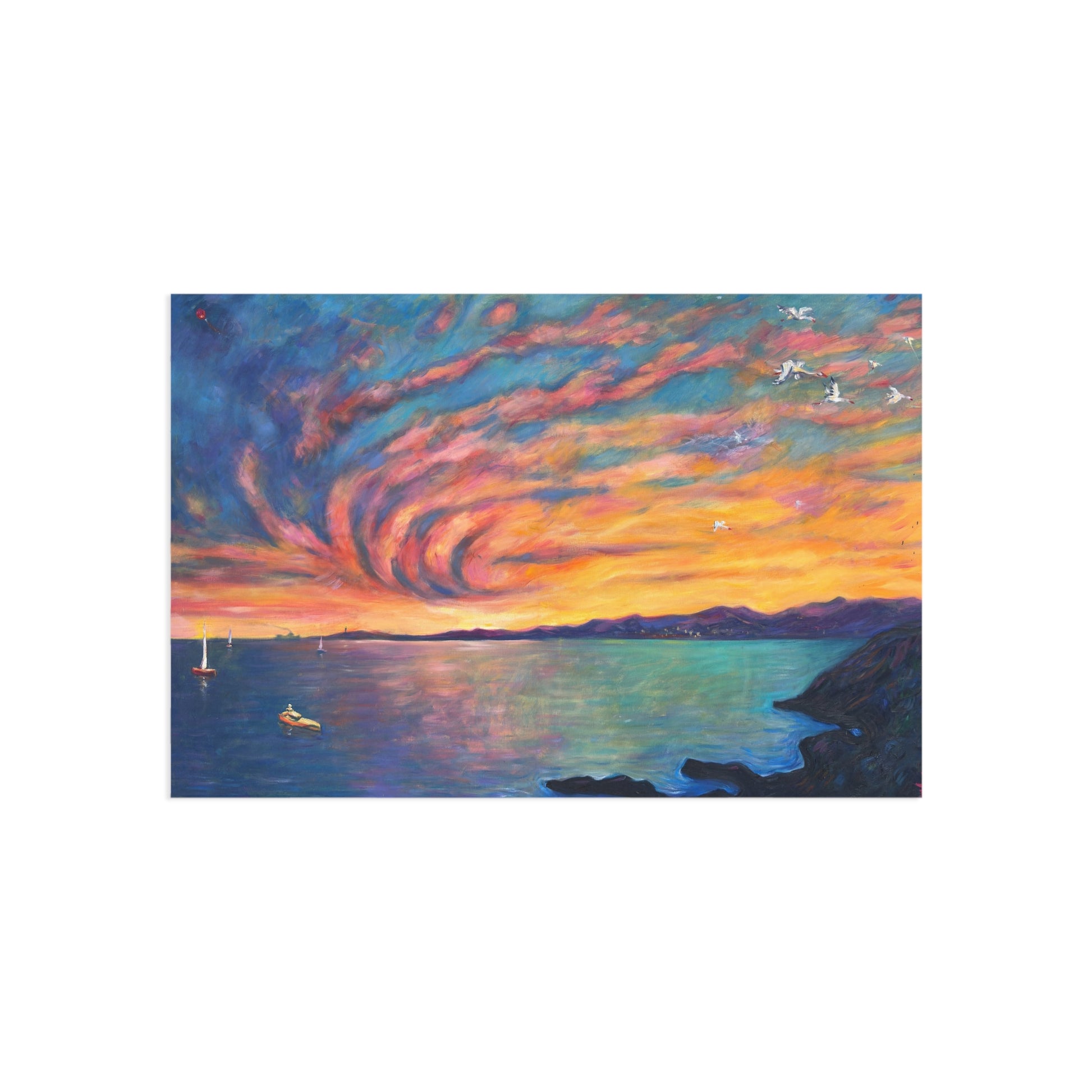 A set of fine art postcards that carry the warmth of a seaside sunset across vibrant, glossy prints. Each card captures painterly skies swirling into the horizon, with rich magentas, golds, and deep indigos rendered in high-detail giclée quality. Slip one into a note to a friend, frame a handful for a mini-gallery wall, or keep them as tactile reminders of evenings spent by water. The imagery feels contemplative and hopeful—small, portable moments of travel and memory that invite slow reading and quiet smiles.